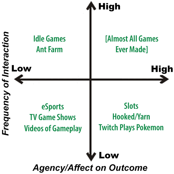 For most of the history of electronic games, the focus has been on the upper-right quadrant. Our workgroup focused on the other three quadrants. The lower-left quadrant contains two main types of player activity. The first we called the Spectating (S); this is the activity of watching competitive games being played - often live and often by high level players. The second type we called Watching (W); this is the activity of watching recorded playthroughs of (usually single player) games. Both of these types of activity involve a player watching a game without any interaction or agency at all. The lower-right quadrant, we called the Low Agency games (L) are games where your actions have very little impact on what happens, either due to the design of the game (as in Slots, or Hooked) or due to the fact that you are only one of many players whose choices affect the outcome. The upper-right quadrant, we called Burst Interactivity games (B). These are games where there’s a long time between interactions, often separated by periods of watching game action. When interactions come, they might be a single interaction, as in narrative games such as Episode or Choices, or a burst of interactions, as in a typical idle game, followed by a long period of passivity. Our preliminary exploration of the topic through this lens, revealed a wide array of relevant games and behaviors that fell loosely into the three passive categories: Low agency/low interaction experiences: