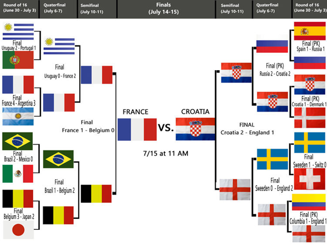 Each team has to play 3 games, guaranteeing that fans of the teams get to watch at least 3 games of their favorite team in the finals. In every match, a winner gets 3 points, loser gets 0, and in the case of a draw each team gets 1 point each. At the end of the 3 games, the 1st and 2nd place team in points get to go to the next stage. The 3rd game of each group is played simultaneously, adding to the sense of drama as many times the result of one game can affect the chances of the team playing in the other game. The remaining 16 teams are distributed in a bracket system. Here is an example of how the brackets played out in Russia 2018: