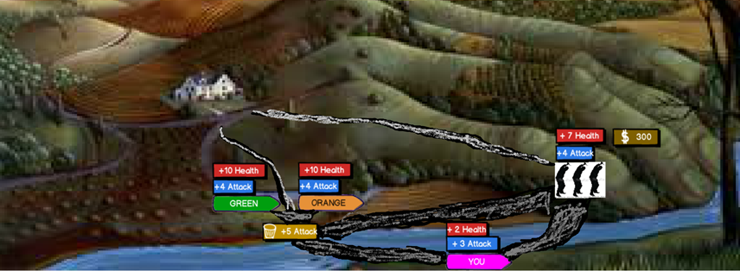 “Do You Really Want to Go Home’s?” Scenario Fleshed Out After working on the report the first day at Horseshoe, I designed the scenario to help inform the content of this paper. This scenario takes place in a high-fantasy RPG. The player-character is from a land inhabited by three ethnic groups. Before their homeland was occupied by a race of sorcerers, these ethnicities had been in conflict with each other off and on throughout the ages. However, with a common enemy and facing the same oppression, the ethnic groups have started to try to work together to overthrow their colonizers. They have not come close to being successful. The sorcerers have robbed the land of their resources, and all of the ethnic groups live in extreme poverty. The sorcerers flaunt their wealth and always carry lots of money on them. Hoping to make at least a little money, the player-character has traveled far from home to look for work in order to send what little is earneds back home. At the beginning of the scenario, the player-character has traveled back to their homeland. Both of their very small children have almost died recently of starvation. The player-character is desperate to get home and be with them. On the road to home, the player-character is faced with several pathways. The pathways will lead them either to a couple of NPCs, each of whom belong to the other two ethnic groups of the land, or sorcerers who are oppressing them. The player-character is weaker in health and attack power than both sets of NPCs. There is a path that leads to a potion that will increase the player-character’s attack stats. This will make them strong enough to kill the sorcerers. Potential Outcomes: